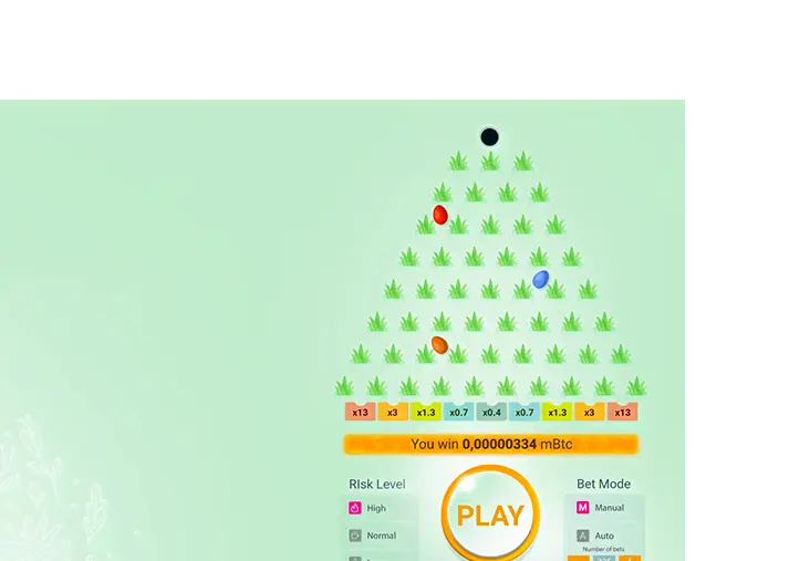 It is a well-known Plinko game in Easter-themed wrap. In this casual game, a ball is dropped down a vertical board and falls into one of several cells with winnings values. A player can choose the number of lines – from 8 to 16.