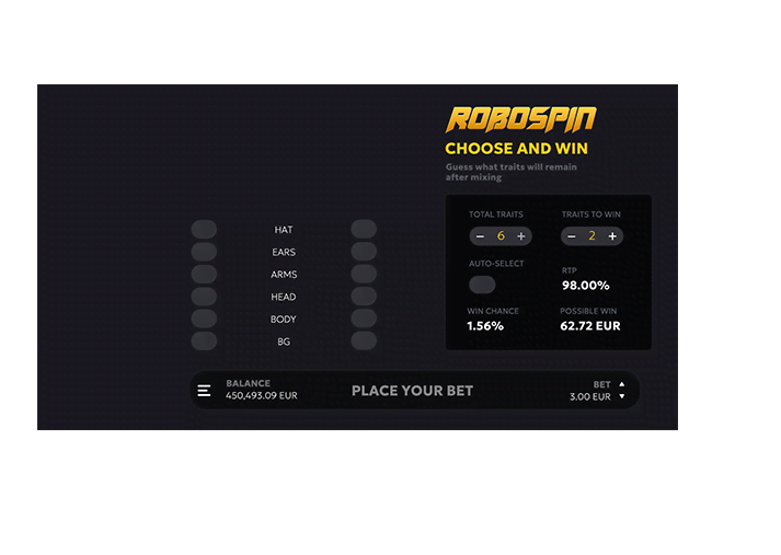 Heavily inspired by Web3 and instant games, Robospin presents an experience you control almost entirely! To build up your balance, you must guess what features a randomly generated robot will have. Set up the number of total active traits and those you need to get right for an instant win and see the game’s RTP, possible win value, and probability of success adapt to your settings. Tune in to your sixth sense and hit play!