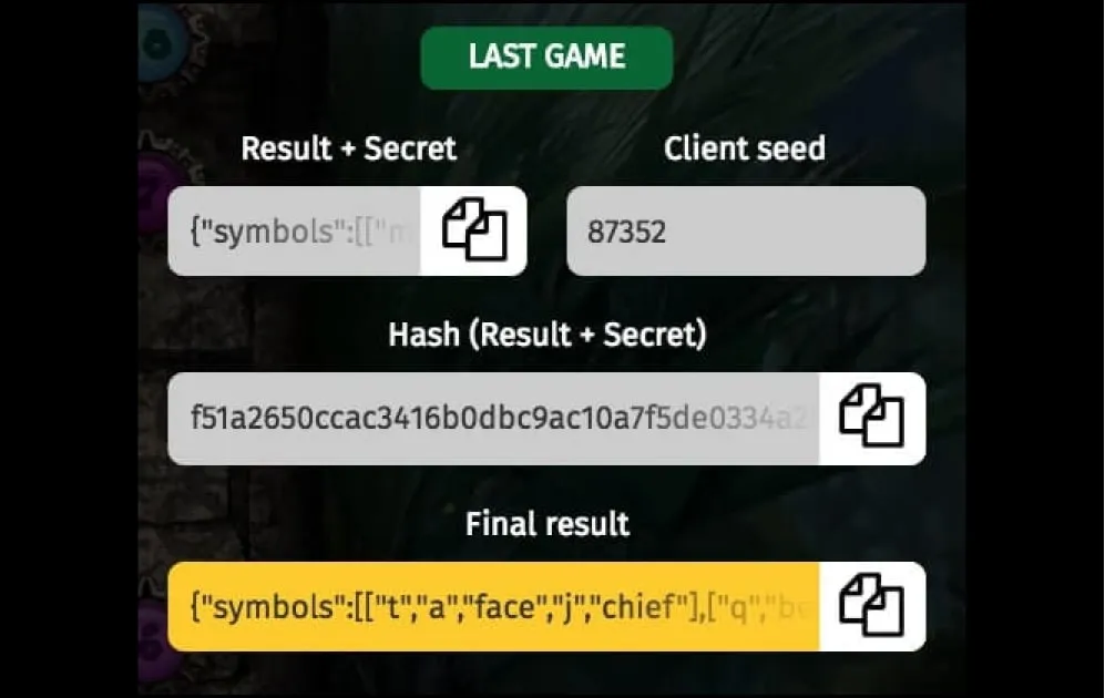 Take the Result + Secret. This looks like a string: {“symbols”: [[“man”,”j”,”t”,”q”,”t”],[“chief”,”girl”, ”j”,”a”,”a”],[“j”,”k”,”q”,”t”,”chief”],[“girl”,”man”,”face”,”k”,”t”],[“k”,”face”,”t”, ”man”,”k”],[“a”,”j”,”a”,”j”,”girl”],[“q”,”t”,”q”,”t”,”t”], [“k”,”a”,”k”,”k”,”a”],[“t”,”beast”,”beast”,”q”,”beast”], [“q”,”j”,”q”,”a”,”t”],[“a”,”k”,”man”,”t”,”a”],[“face”,”a”,”face”,”q”,”face”]], ”card”:”4H”,”game”: