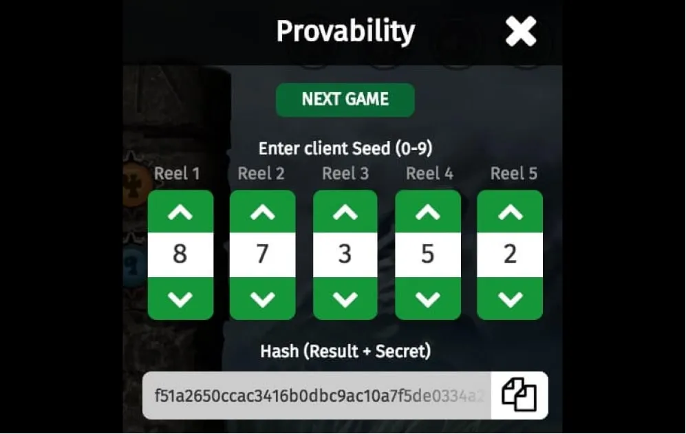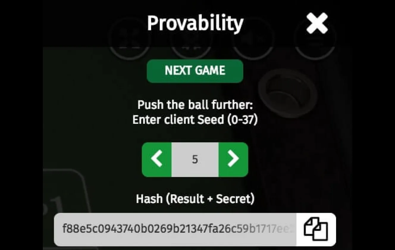This is Next game block of the Provably Fair widget – Hash (Result + Secret).