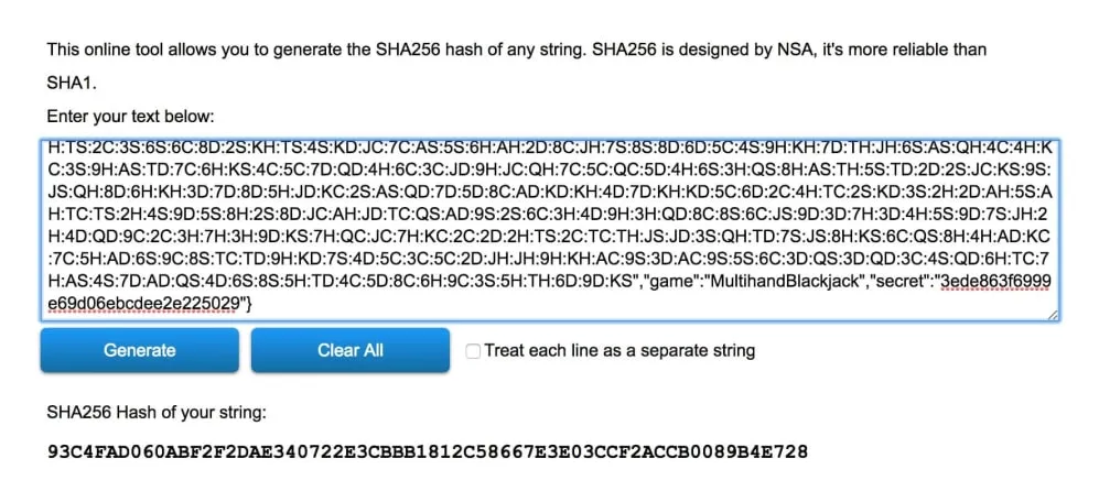 Now let’s compare the Hash our online tool generated to the one player received in the game – Hash (result + secret) 93c4fad060abf2f2dae340722e3cbbb1812c58667